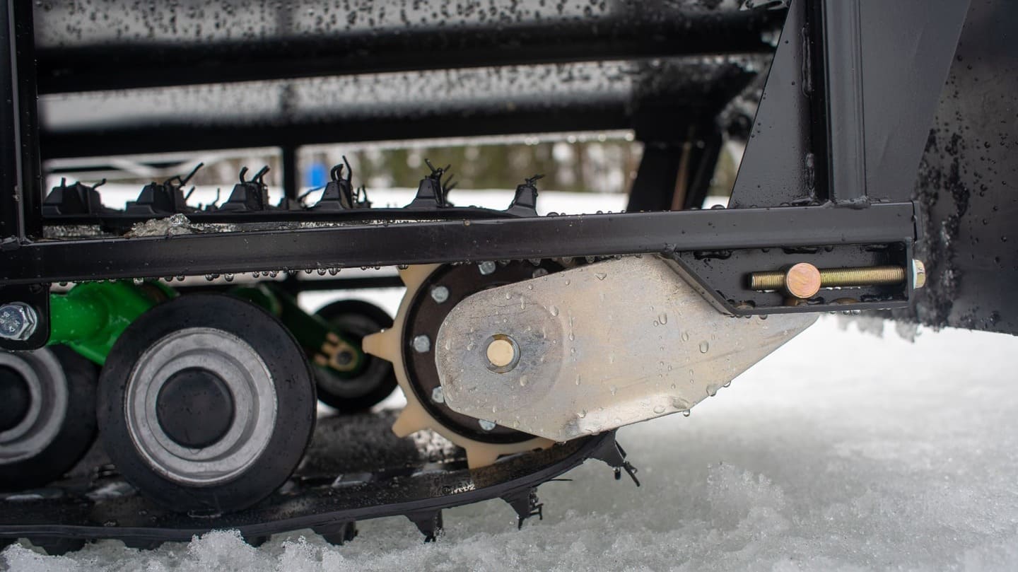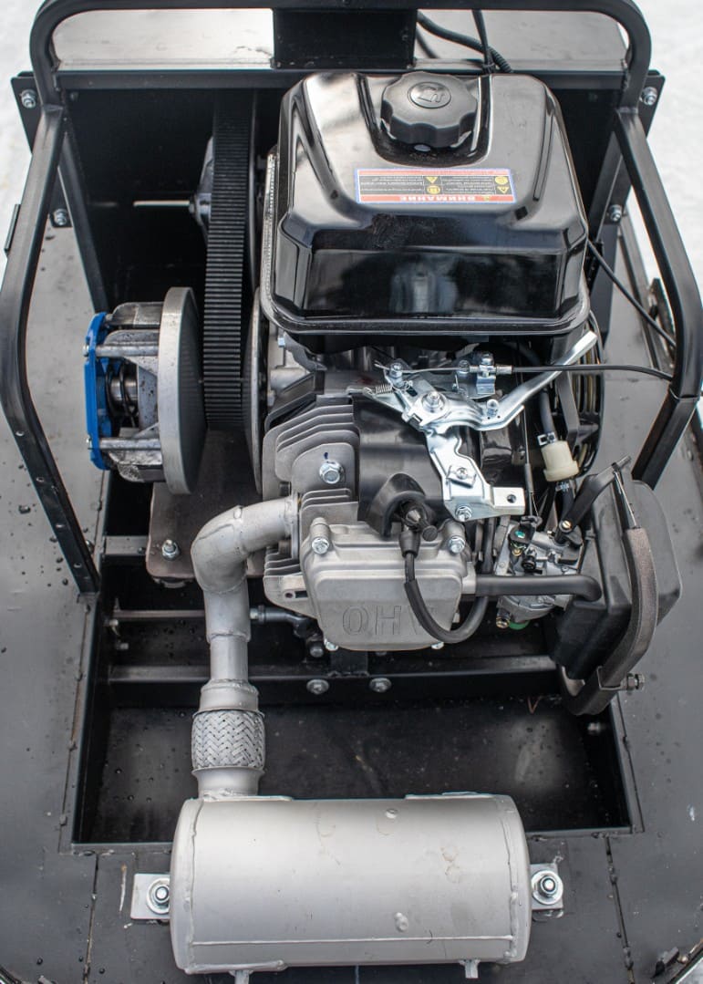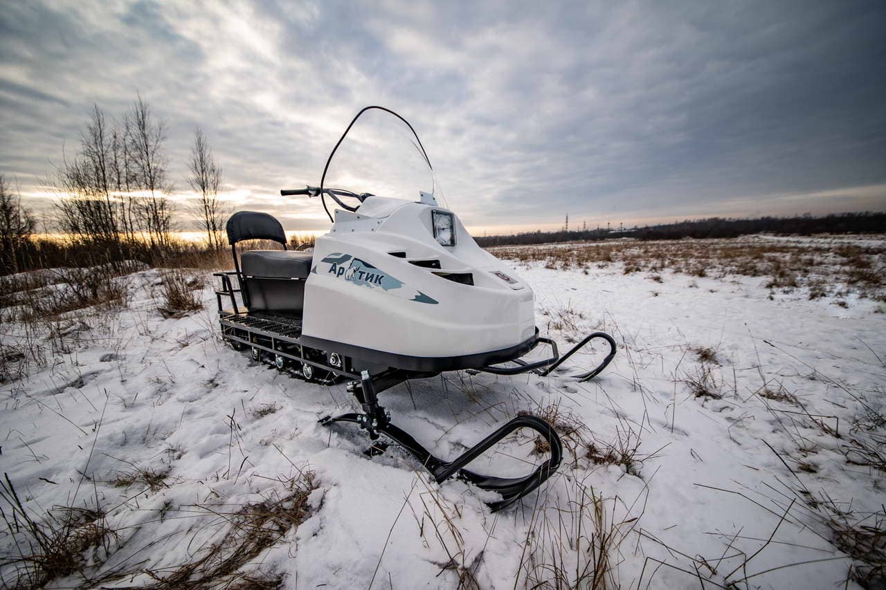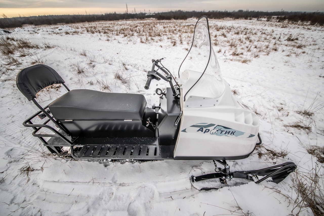 Снегокат оснащен защитой двигателя, улучшенной задней подвеской с амортизатором. Гусеница имеет длину 2828 мм и ширину 500 мм. Снегоход также имеет простую и надежную переднюю 2-х лыжную рессорную подвеску и стальные лыжи, что обеспечивает отличную управляемость и маневренность.