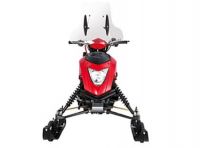 Снегокат имеет две широкие пластиковые лыжи и резинотканевую, армированную гусеницу шириной 38 см. Это помогает снизить давление на снежную поверхность, а дисковые тормоза обеспечивают чувствительную реакцию на действия водителя. Снегоход также оснащен одноцилиндровым, четырехтактным мотором с системой воздушного охлаждения и электронной системой зажигания, которую можно запустить при помощи электрического или ручного стартера. Важно отметить, что снегоход поставляется без ПТС.