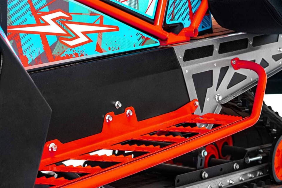 Классический катково-склизовый гусеничный блок снегохода в сочетании с четырьмя амортизаторами обеспечивают комфортную езду на любом покрытии. Длинная и широкая гусеница с грунтозацепом 19 мм создает большое пятно соприкосновения с поверхностью и значительно увеличивает проходимость снегохода.