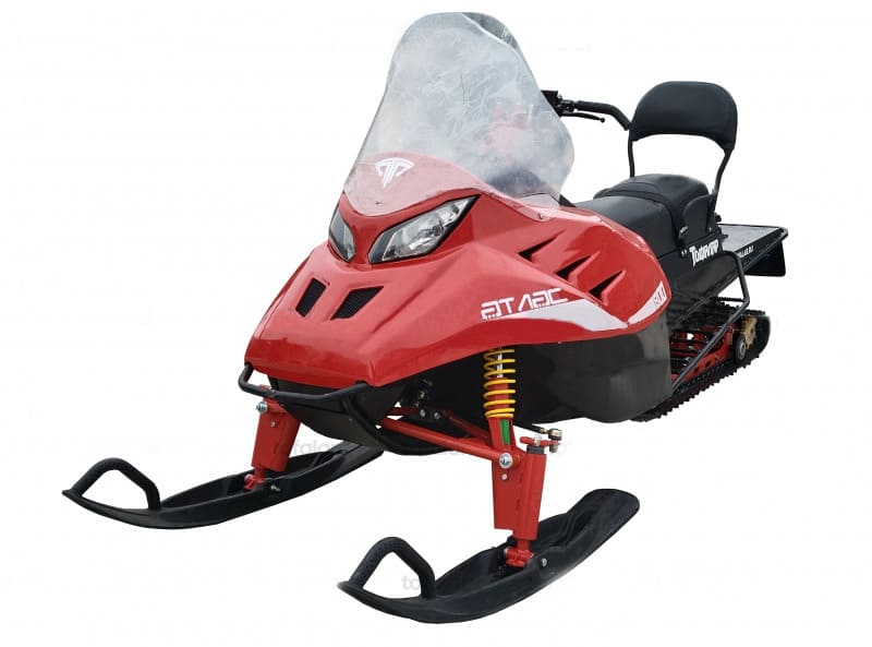 Гусеницы снегохода обладают хорошим сцеплением со снегом и обеспечивают безопасность райдеру. Особенно это важно, когда речь идет о подъемах по заснеженным тропам. На снегоходе установлены подвески: