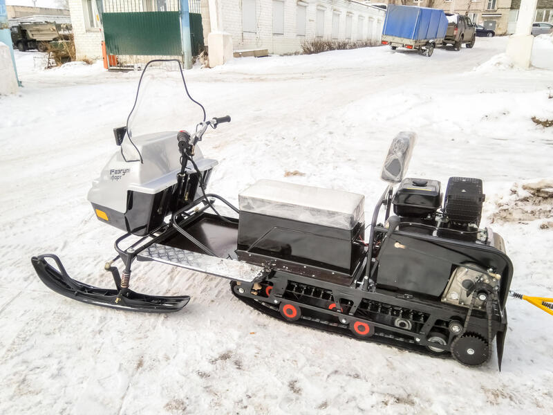 Лыжный модуль у мотособаки данной модели обеспечивает отличное сцепление с поверхностью и позволяет машине безопасно передвигаться по снежным участкам. Корпус техники обладает удобной и комфортной конструкцией, что делает его идеальным для перевозки пассажиров и грузов.