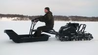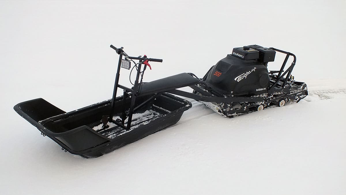 В конструкции мотовездехода используется цельная резиновая гусеница шириной 500 мм. Гусеница в сочетании с катковой подвеской способна проходить спокойно по льду и даже по территории без снега.