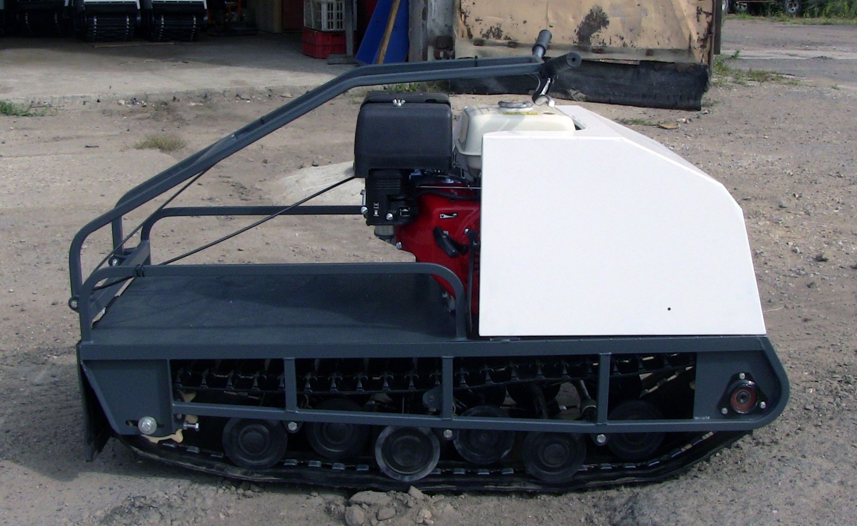 На мотобуксе установлена катковая подвеска. Катки устанавливаются на оси и предназначены для смягчения ударов и вибраций, возникающих при движении по неровной местности. Подвеска также способствует лучшей проходимости и устойчивости мотобуксировщика, обеспечивая более комфортное и безопасное передвижение как в сельской местности, так и на дорогах.