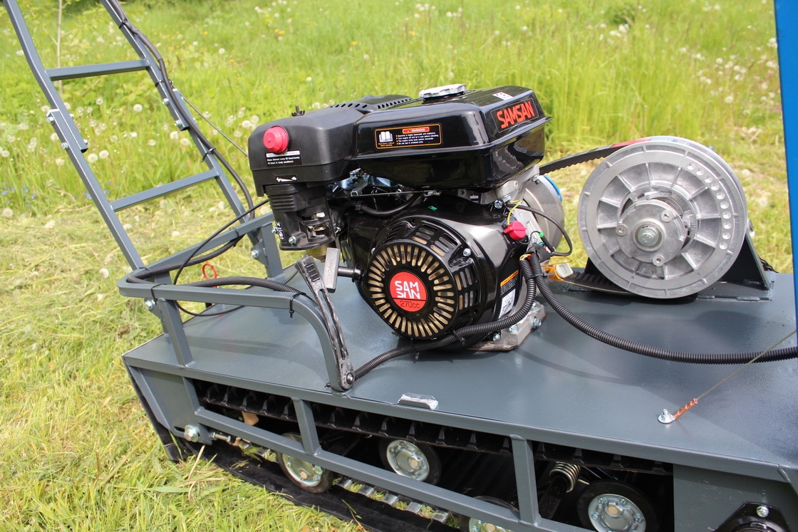 На мотобуксе установлена катковая подвеска. Катки устанавливаются на оси и предназначены для смягчения ударов и вибраций, возникающих при движении по неровной местности. Подвеска также способствует лучшей проходимости и устойчивости мотобуксировщика, обеспечивая более комфортное и безопасное передвижение как в сельской местности, так и на дорогах.
